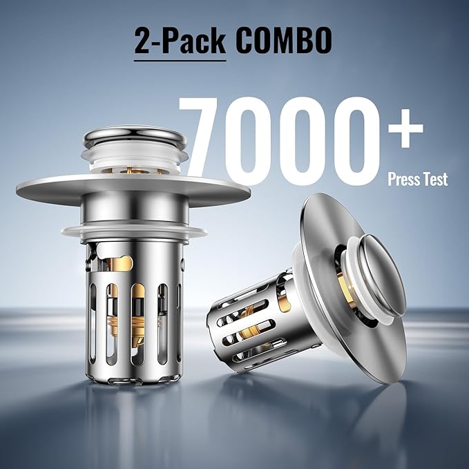 - [🛡️ All-Metal & Unbreakable Durability] Built to last a lifetime, the entire sink drain mechanism is crafted from premium stainless steel and a corrosion-resistant solid brass core. Unlike flimsy plastic alternatives, our drain stopper withstands extreme daily use, and the hardened bronze spring switch is tested over 7000+ cycles without failure. The robust construction guarantees a reliable 3-5 year lifespan, far outlasting ordinary drain strainer and rubber components.